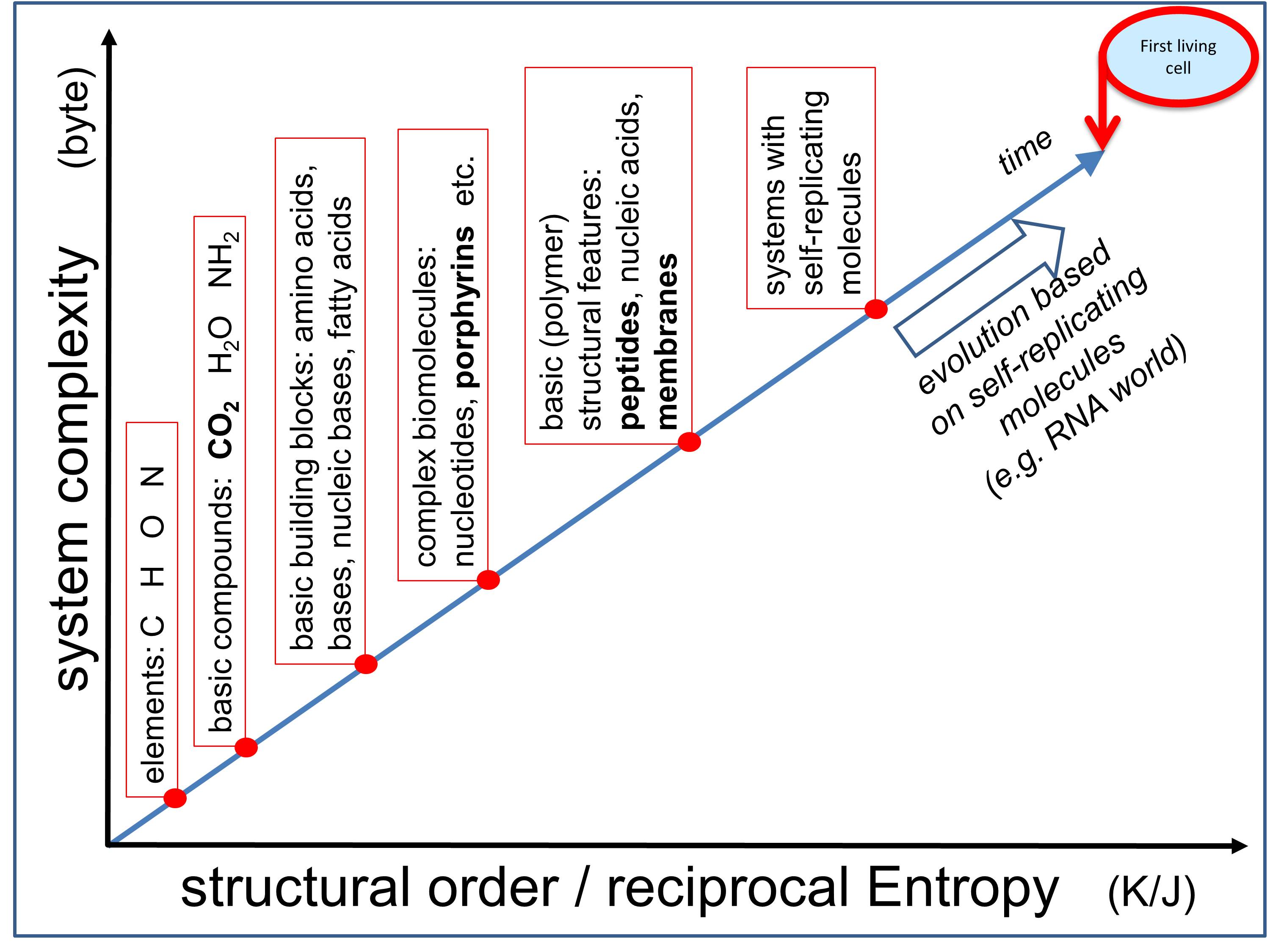 It thus clearly distinguishes itself from chaotic reaction processes (complexity without order) and from simple crystallization processes (order without complexity). All steps in prebiotic chemistry must therefore lead to molecules whose complexity is greater than that of the reactants, for example to macromolecules with a defined sequence or generally molecules with a higher molecular mass. On the other hand, the product must also be enriched and selected from possible, less functional by-products, so that a product with minimal mixture entropy can be assumed (order).